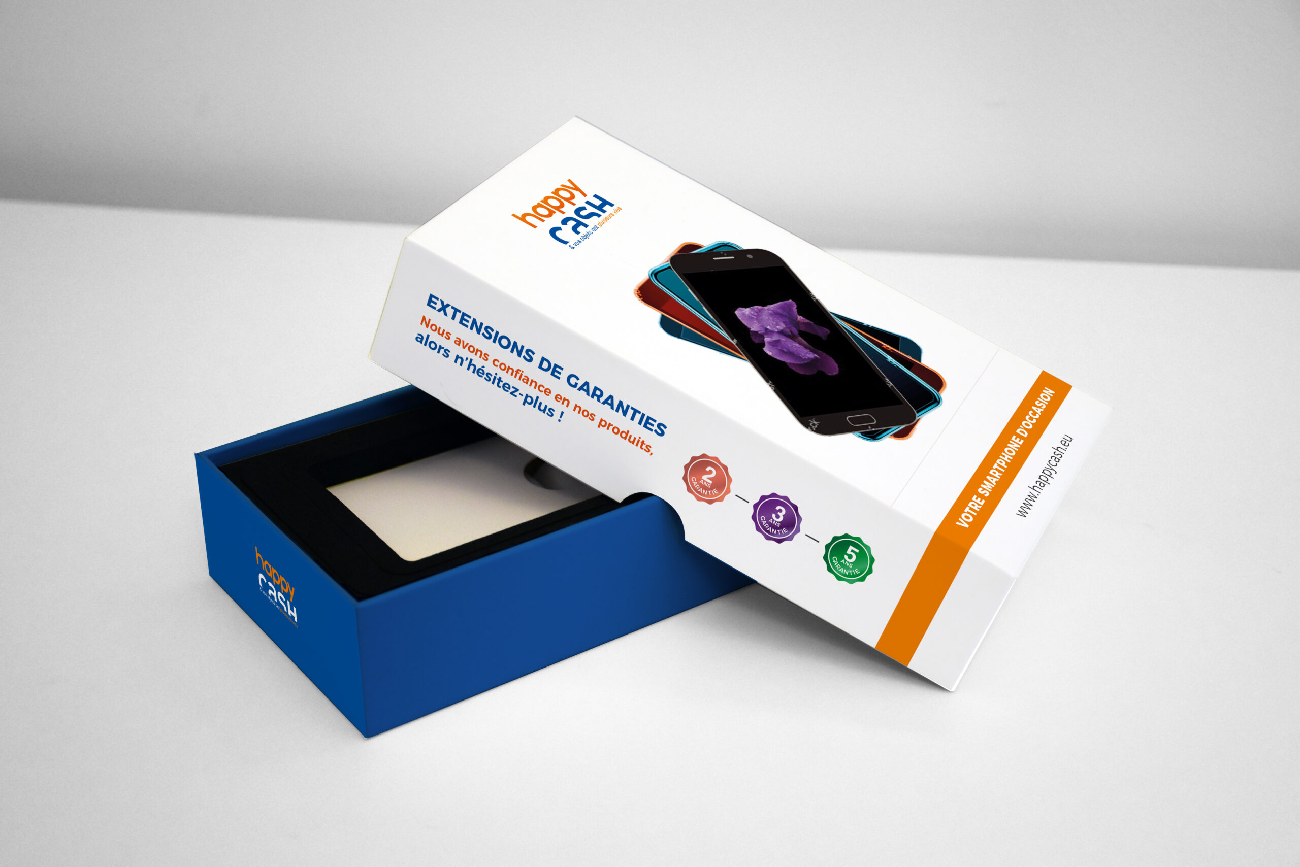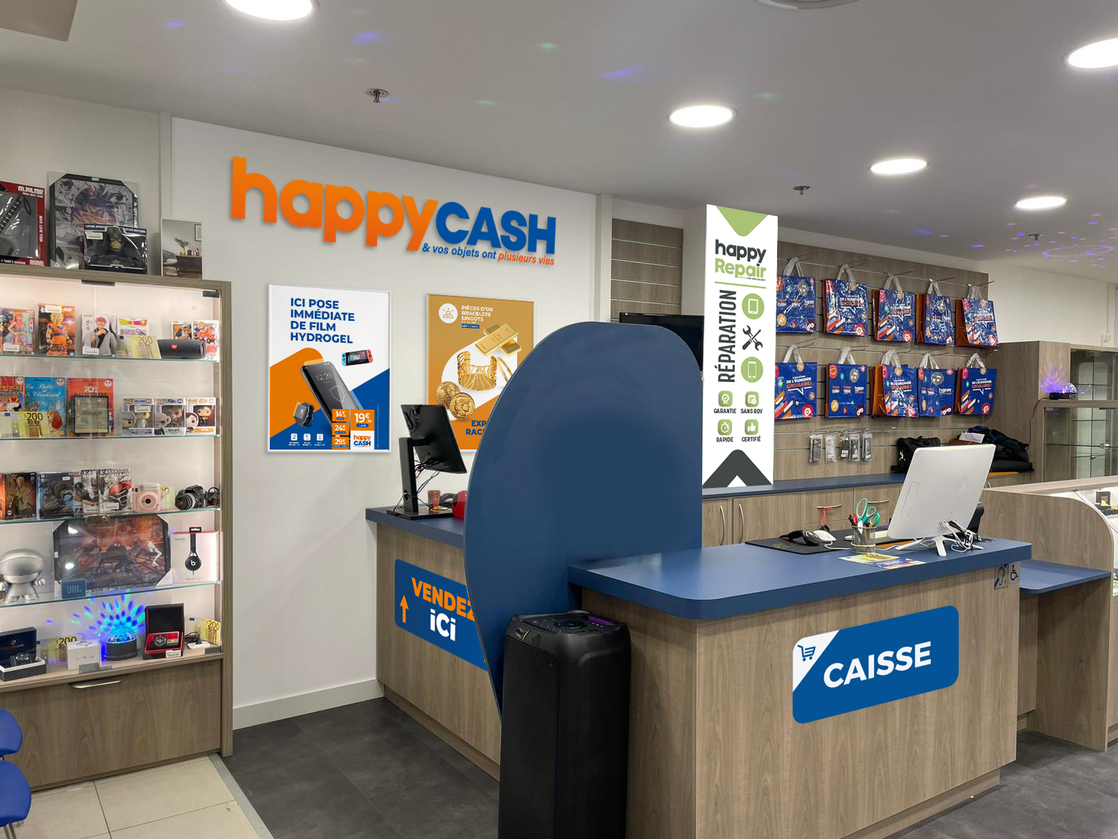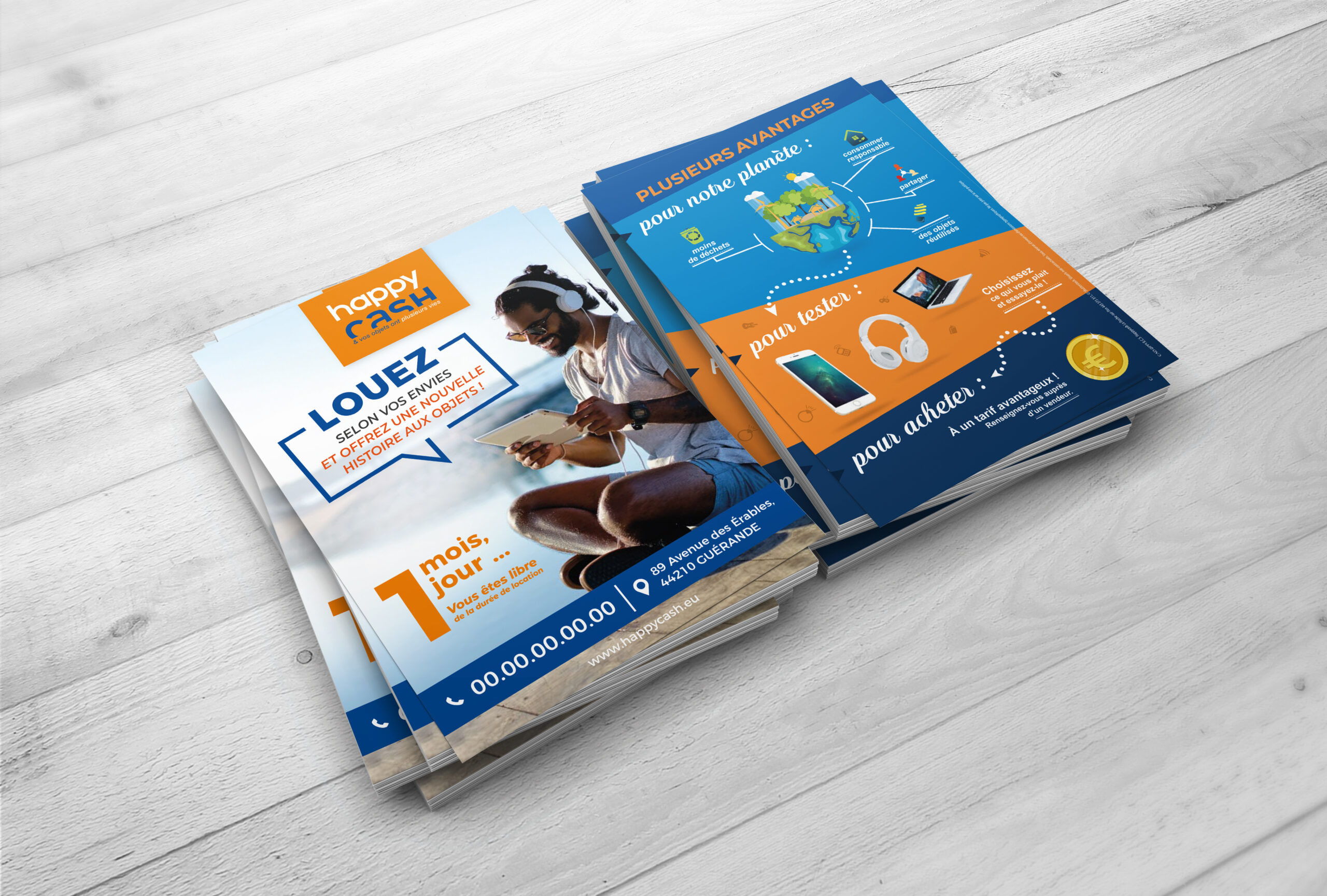 Client depuis 2018, nous travaillons en collaboration avec le siège : Happy Business pour tout le développement de la communication de ses enseignes. Happy Cash, Happy Troc, Happy Cash Services, Happy Cash Éco, Happy Repair, Happy Deal Online … Logotype, charte graphique, opérations de communication, affiches, flyers, ouverture de magasins, devantures, site internet etc.